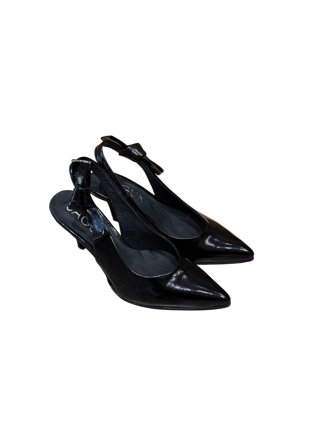Zapato confeciionado en cuero charol vacuno con detalle de moño.